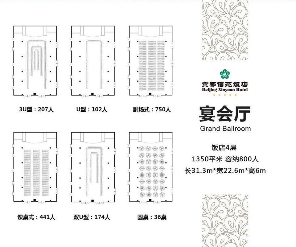 大宴会厅位于酒店四层,总面积1350平方米,可容纳800人,是酒店最大的宴会会场。宴会厅分为上下两层,上层环绕着20个共可容纳200人的私密包厢,可全方位俯瞰会场全貌。大厅还可分为3个独立会场。适合举办各种大型会议及婚宴、桌餐、自助餐等宴会。
